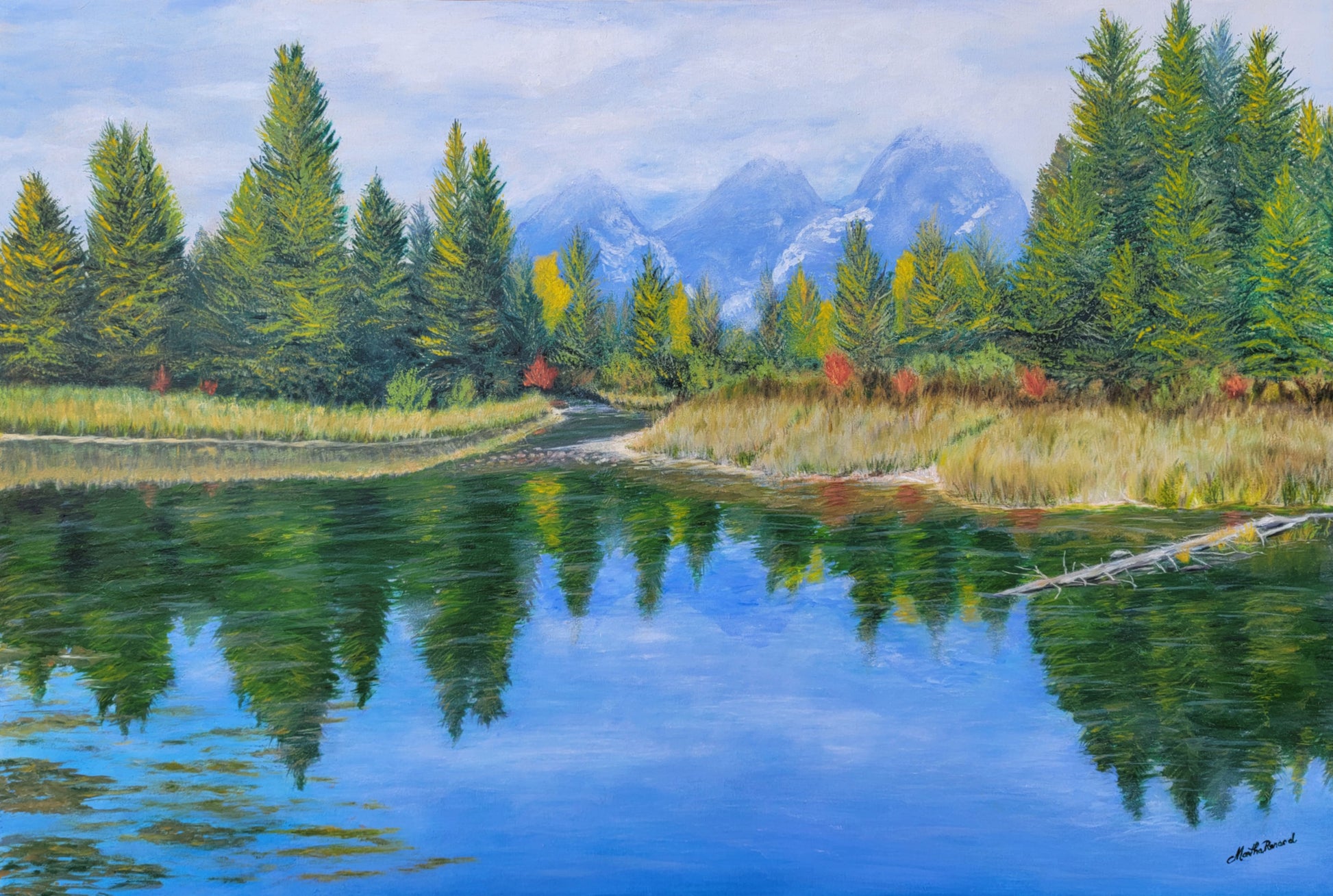 Oil on canvas. 24 x 36. Walking along a trail, the lake peaceful along side. The birds sound breaks the silence. I pause to enjoy the view and want to remember this moment forever. I have found solace in Wyoming. Is there a better color combination to represent nature than blue and green?