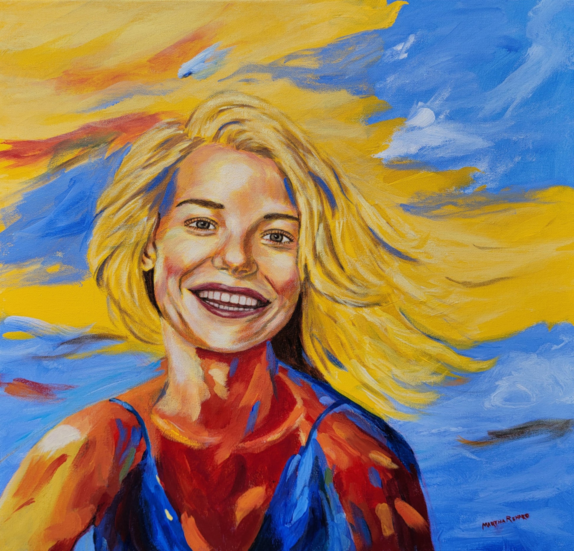 Acrylic on canvas. 20 × 20. Whether it’s spending the day walking on the beach, or having lunch with friends, laughing the day away makes all of life fade. It’s pure joy. This woman has given herself that time to forget all the stress and time to enjoy life.