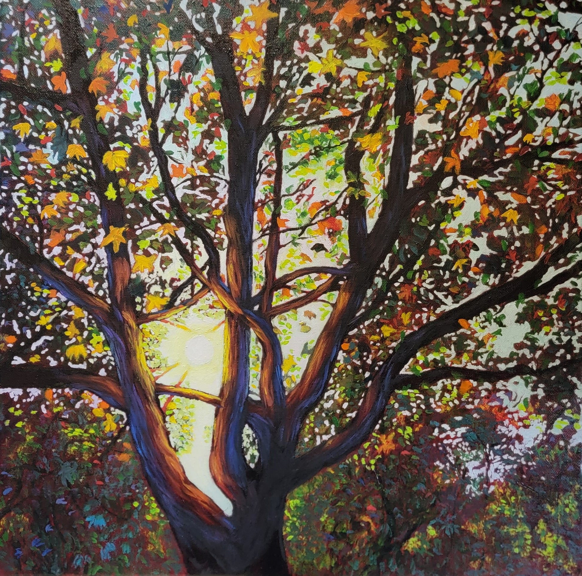 Oils on canvas. 18 x 18. Fall leaves circling through the trees. Glistening as the rising sun touches them and makes the colors brighten.